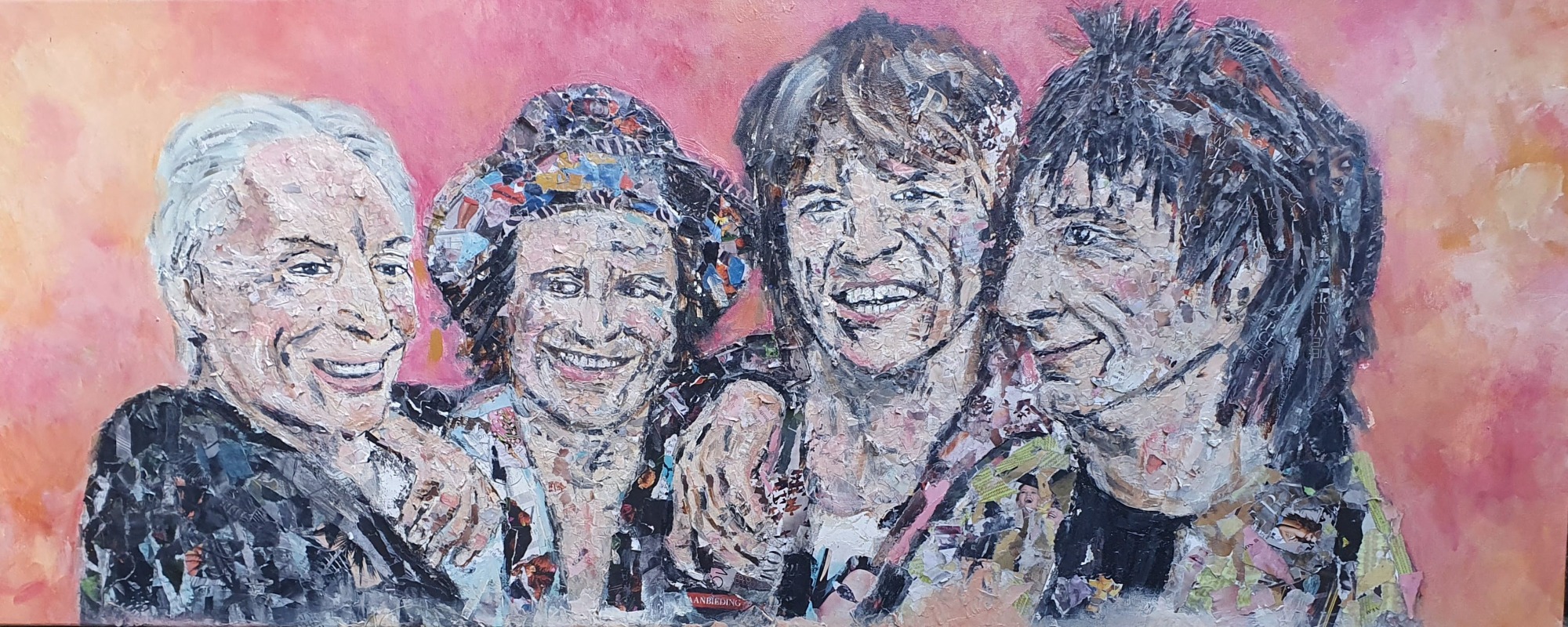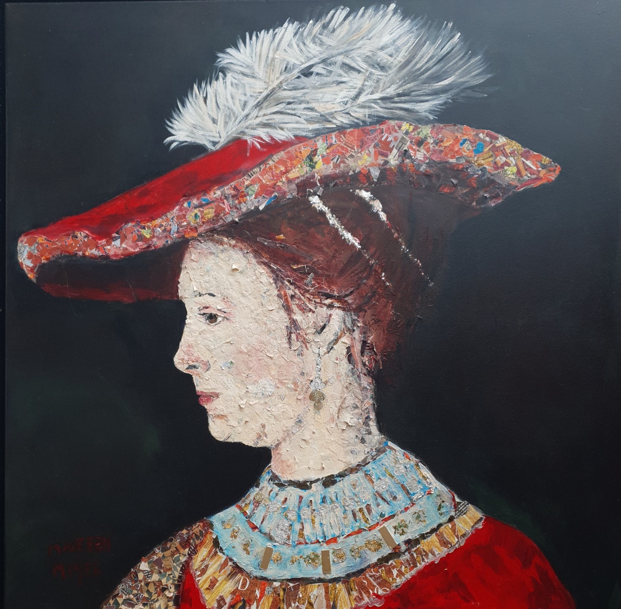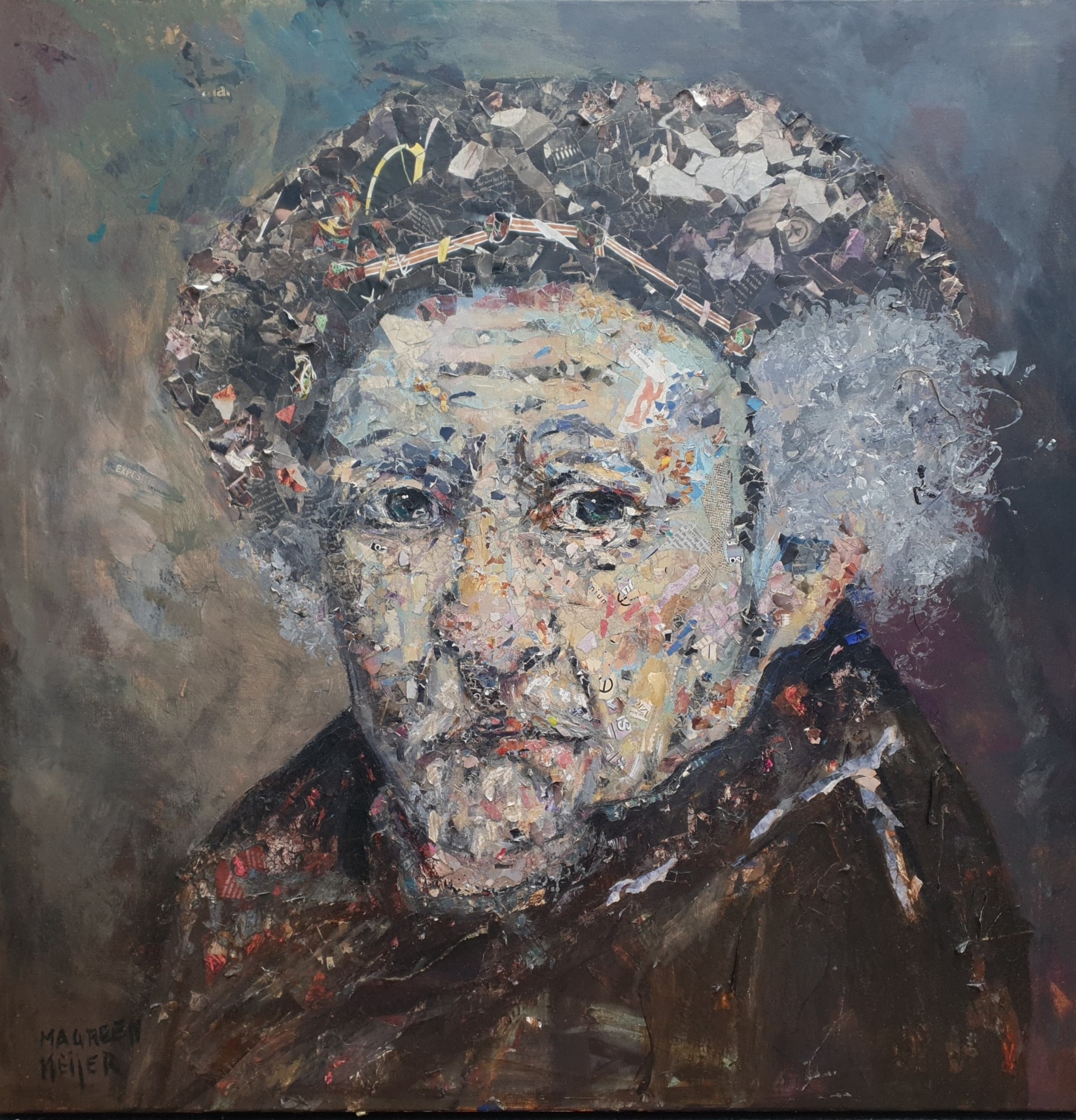 Deze portretten zijn opgebouwd uit vele lagen gescheurd papier en acrylverf. Door het werken in lagen ontstaat een rijke textuur